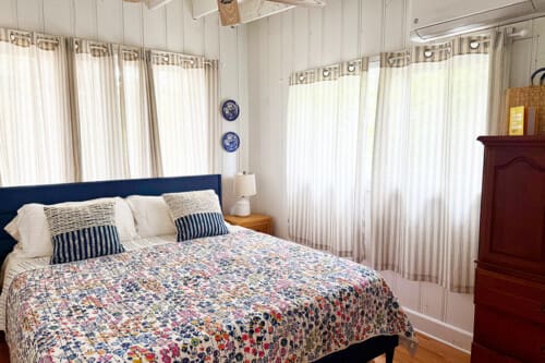 The fully air-conditioned main house has two bedrooms and a bath with shower. The primary bedroom has a king-sized bed and the other offers twin (2 single) beds. There is a bunkhouse with queen-sized bed, powder room and washer and dryer. The air-conditioned guesthouse has a king-sized bed, a day bed and a full bath with tub.
