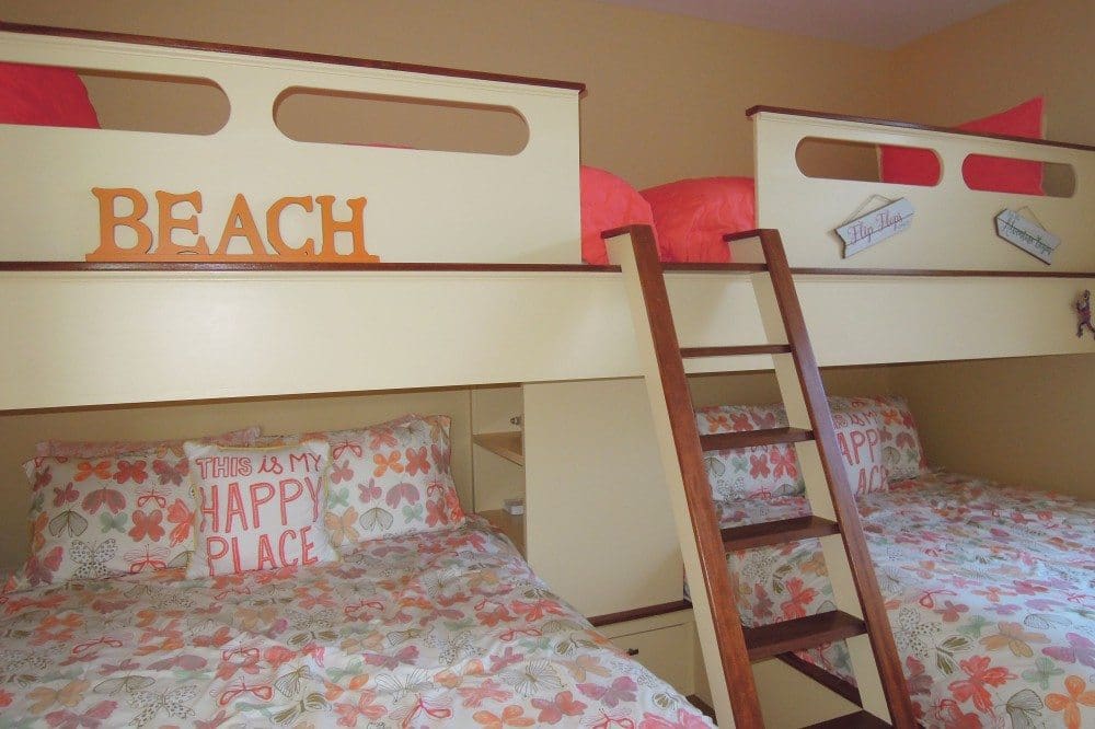 The master bedroom, with en suite bath, has a king-sized bed. Another bedroom has a queen-sized bed. The guest bedroom has a full bed and the children will delight in the full beds tucked beneath an upper level of single beds. There is a laundry and additional bath with shower in the entrance hallway.