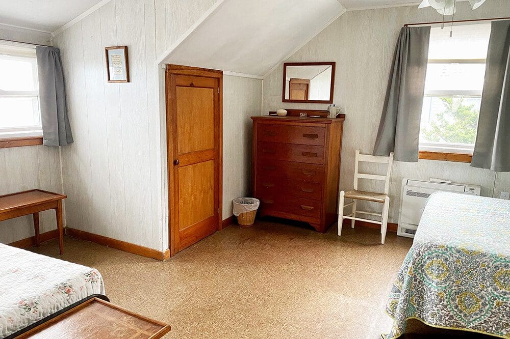 There is a dining table on the front porch, a full bath and two generously sized bedrooms (queen with powder room and a double and single bed) on the main floor. Another full bath and additional bedrooms (queen, and 2 bedrooms that have both a queen and a single) are upstairs.