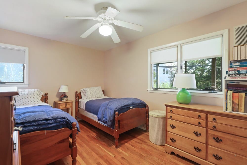 Have a marvelous summer holiday in this beautifully appointed home in central Saltaire. Here you are a short block from the field, the playground and the bay beach. The trip to the store, the ferry and the ocean is quick and easy. The house is fully equipped. It is an open breezy up-side-down house with a large L-shaped living area off of which is master bedroom with king-sized bed and full bath that can be closed off to create an en suite master bedroom. The open living and dining area has sliders that lead to a spacious deck. The deck wraps around the upper level where there is a BBQ, outdoor tables and comfortable sun and shade deck seating with partial bay views.