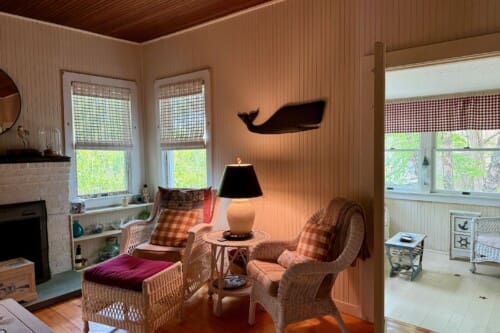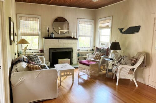 Enter the house to a welcoming wicker-filled porch. The living room, located just behind the porch, is comfortable and cozy. There is a separate dining room and three bedrooms (2 with full-sized beds; one with a queen-sized bed and en suite bath). Both baths have showers.