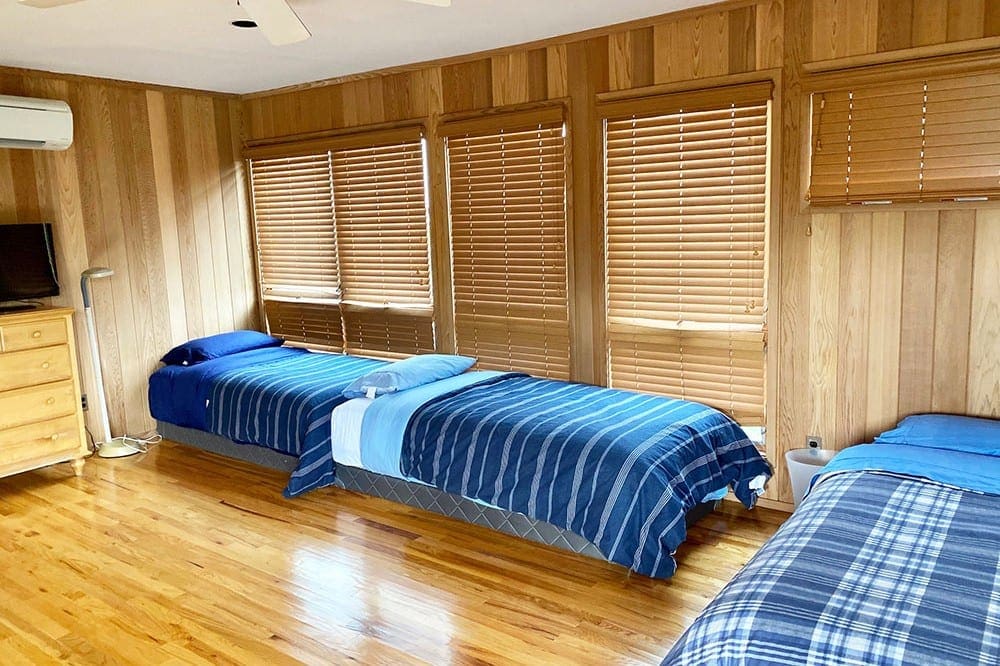 The primary bedroom with king-sized bed and full bath adjoin the living spaces on the upper level. There are an two additional bedrooms and both a full and a half bath on the entrance level. One of the bedrooms has a queen-sized bed; the other has three beds (three singles) that can be configured to suit your requirements. Every room in the house is air-conditioned with DirecTV and wireless Internet.