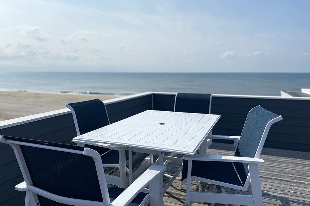 Vacationing on the oceanfront is one of the special pleasures of a beach holiday. The configuration of this oceanfront not only brings the beauty of the ocean inside, but it also allows for amazing 360 degree views that include the F.I. lighthouse and the Great South Bay. This comfortable fully equipped home offers 4 beds, a den with two pullout sofas, two full baths and one half bath. The den with oceanfront deck, three bedrooms, all with queen-sized beds, a bath with tub, and a powder room are situated at the entrance level. The living area, primary bedroom, balcony, and en suite bath with shower are upstairs. The table on the dining room deck seats 12. Every room faces the water.