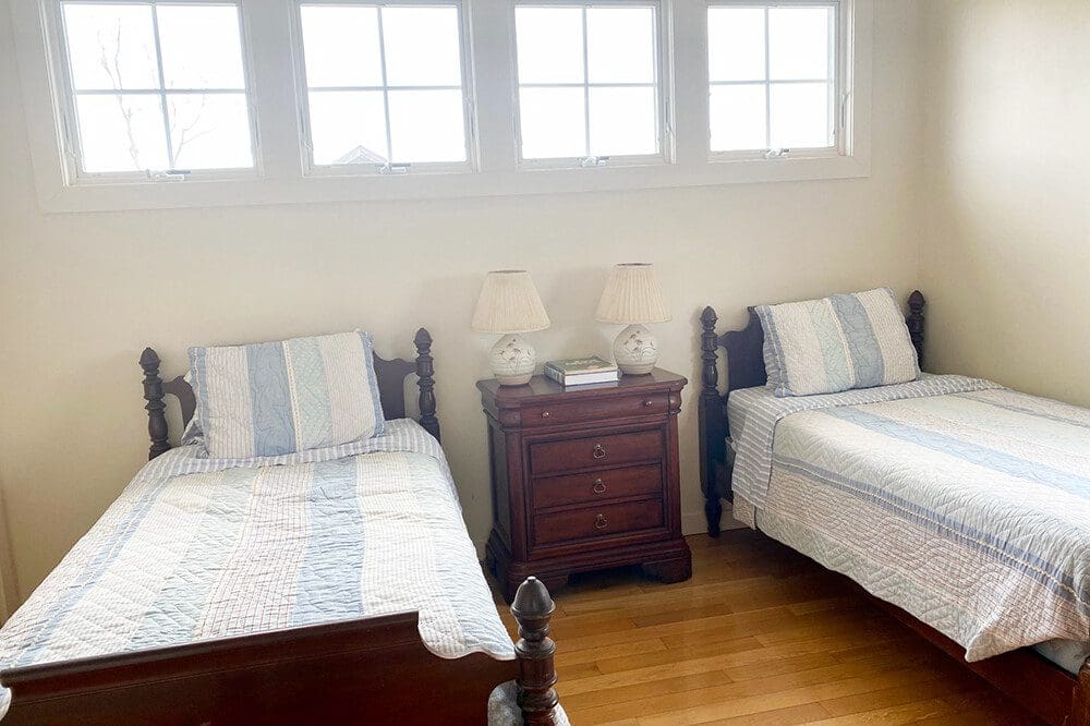Four of the six bedrooms and two full baths are upstairs.The primary bedroom has a queen bed and deck with bay views. There are two single beds in two of the upstairs bedrooms and another has a full bed.