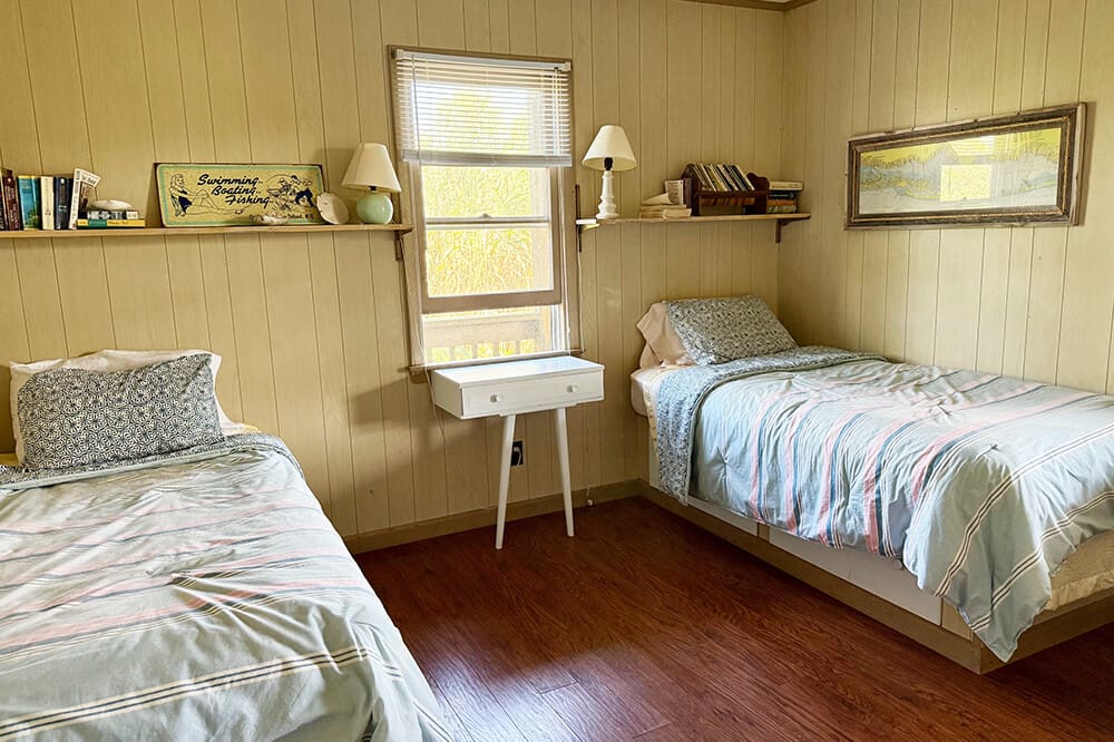Four bedrooms and a bath are on the entrance level. Two bedrooms have full beds and the other two bedrooms on the entrance level have twin beds. The primary bedroom upstairs has a king-sized bed, seating area and full bath.