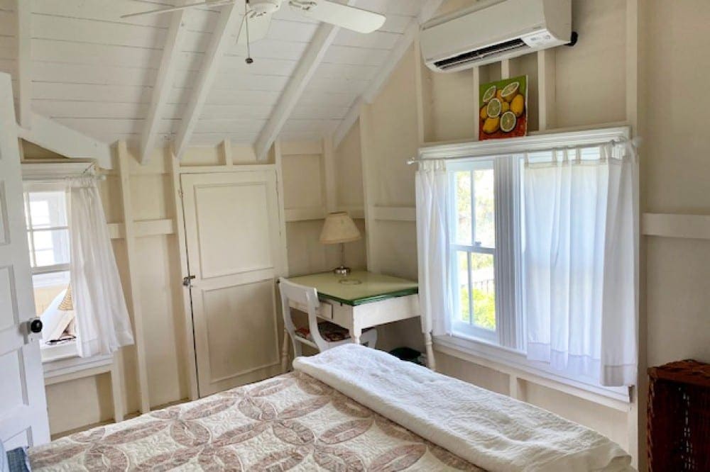 There are 3 bedrooms and 1.5 baths on each floor. On the entrance level, one bedroom is an office with a futon bed, another has twin beds, and the third has a single bed. Upstairs one bedroom has a queen-sized bed and powder room; the other has a double bed. There is a sleeping porch with two single beds.