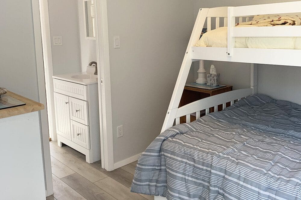 Cooled by split-system air-conditioning and enjoying an enclosed spacious back deck, the cottage is perfect for both work and play. The primary bedroom has a queen-sized bed and powder room. The guest bedroom has twin (2 single) beds and there is a full bath with shower in the hallway. The bunk house has a powder room and bunk beds with a full-sized lower mattress.
