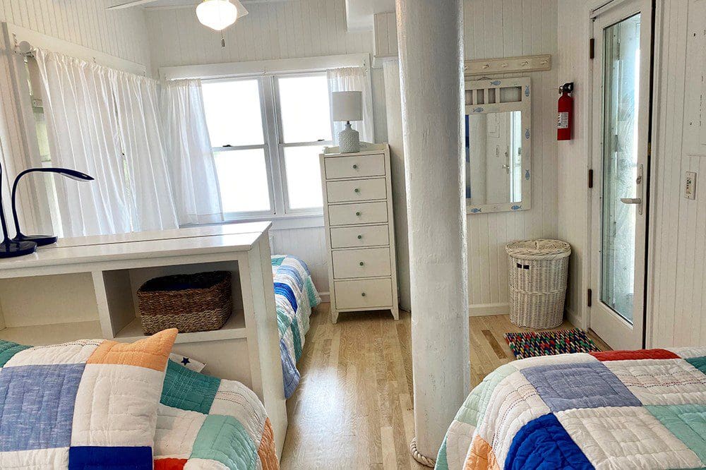 Large breezy decks surround the house with both sunny and shaded seating and dining areas. Enjoy sun-filled; air-conditioned upstairs living spaces where you will find living and dining, three bedrooms, two baths, a sun room and open chef’s kitchen. Three additional air-conditioned bedrooms with 1.5 baths are located behind the dunes below the main living area. They consist of two guesthouses that are entered separately, one is two beds and a full bath; the other is a bunkhouse with powder room. They are air-conditioned and perfect for parents, older children and/or guests.